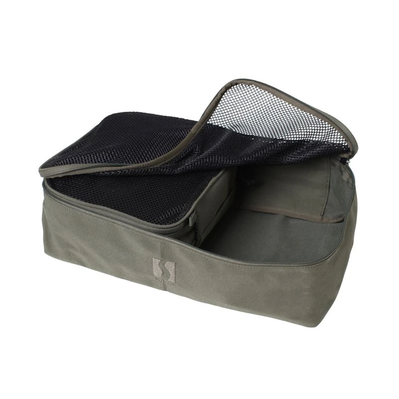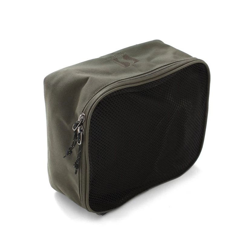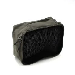 Mesh Cube er konstrueret i en lækker, kraftig og blød polycotton i en nedtonet grøn farve, som med tiden vil få en unik patina. Låget i mesh er nemt at se igennem, som gør det enkelt at holde styr på hvad der er pakket.