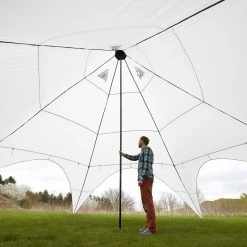 Sammenpakket kan teltet nemt flyttes af en person. Det rejses hurtigt ved hjælpe af midterstangen og har du prøvet det nogle gange, kan det godt lade sig gøre ene mand. Det er dog nemmere, hvis I er flere til at få fordelt og fæstet stjernens spidser korrekt inden midterstangen sættes op.