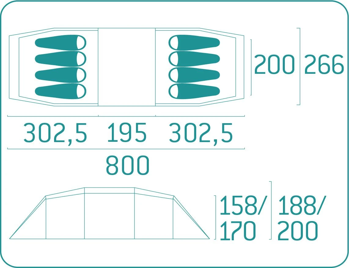 Hver sovekabine måler 280 x 245 cm. og har dermed god ligge- og soveplads til 4-5 personer i hver kabine. Totalt kan teltet altså rumme op til 10 personer. Er der kun 3-4 personer i hver kabine, er der også god plads til bagagen.