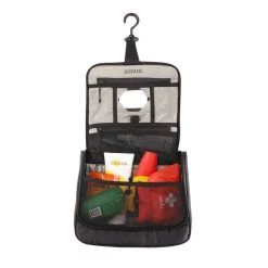 Det lille spejl i toilettasken er en god detalje, når du om morgenen skal have styr på kontaktlinserne eller hurtigt ”nette” dig lidt. Den gode store krog i toppen kan drejes 360 grader og gør det nemt at hænge toilettasken op de fleste steder. En super god detalje uanset om du er på hotel eller campingplads.