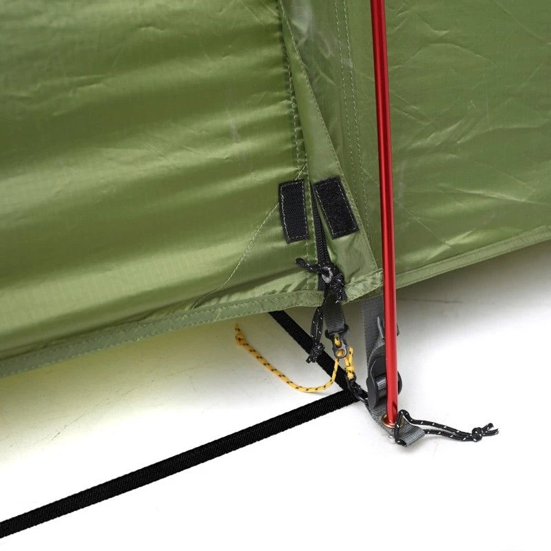 Konstruktionen gør det muligt at rejse teltet af en person: Før alle 3 stænger ind i oversejlet, derefter bues de og fæstes i den anden side. Sæt de to hjørnepløkke i den ene ende af teltet og tag så fat i den anden ende – her er det smart lige at løfte op i teltet så alle stænger løftes fra jorden, stræk teltet helt ud og sæt de sidste to hjørnepløkke. Herfra kan du fæste resten af pløkkerne og bardunerne.