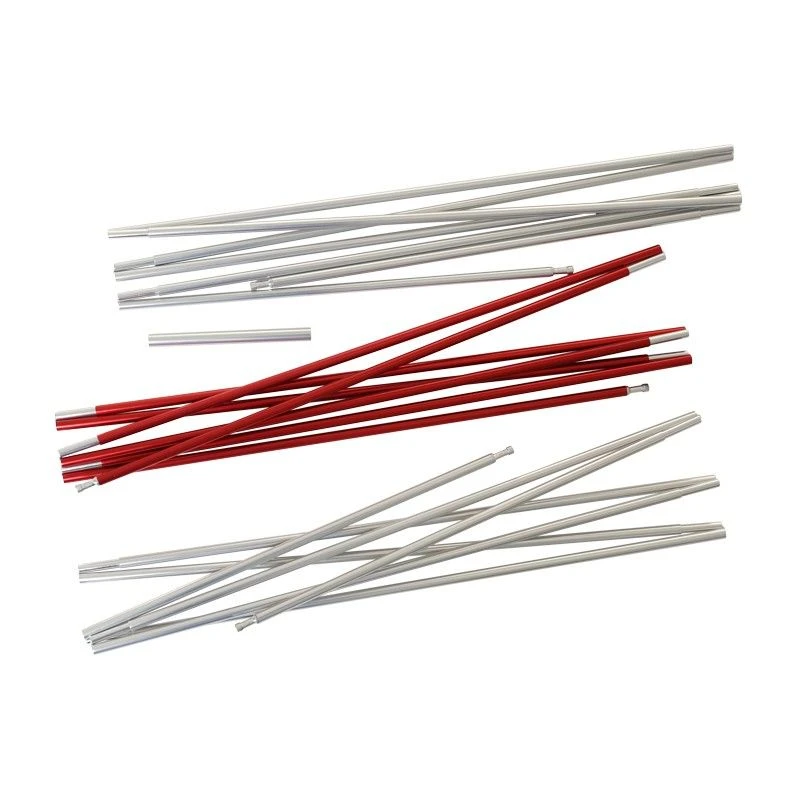 Stængerne er farvekodet, så stangfarven passer med kantfarven på kanalerne i teltet. Og der er elastisk fæste til bardunerne, så de kan rulles op og du undgår kluddermor, når teltet skal sættes op og sikres i en fart.