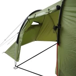 Konstruktionen gør det muligt at rejse teltet af en person: Før alle 3 stænger ind i oversejlet, derefter bues de og fæstes i den sidste ende. Sæt de to hjørnepløkke i den ene ende af teltet og tag så fat i den anden ende – her er det smart lige at løfte op i teltet så alle stænger løftes fra jorden, stræk teltet helt ud og sæt de sidste to hjørnepløkke. Herfra kan du fæste resten af pløkkerne og bardunerne.