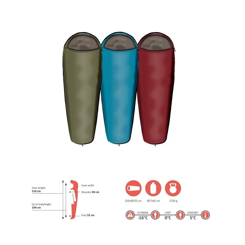 Kansas 190 er isoleret med fiber, har yderstof i ripstop polyester og inderstof i blød polyester mikrofiber. Den vejer 1800 gram og fylder sammenpakket 40 x 27 cm.