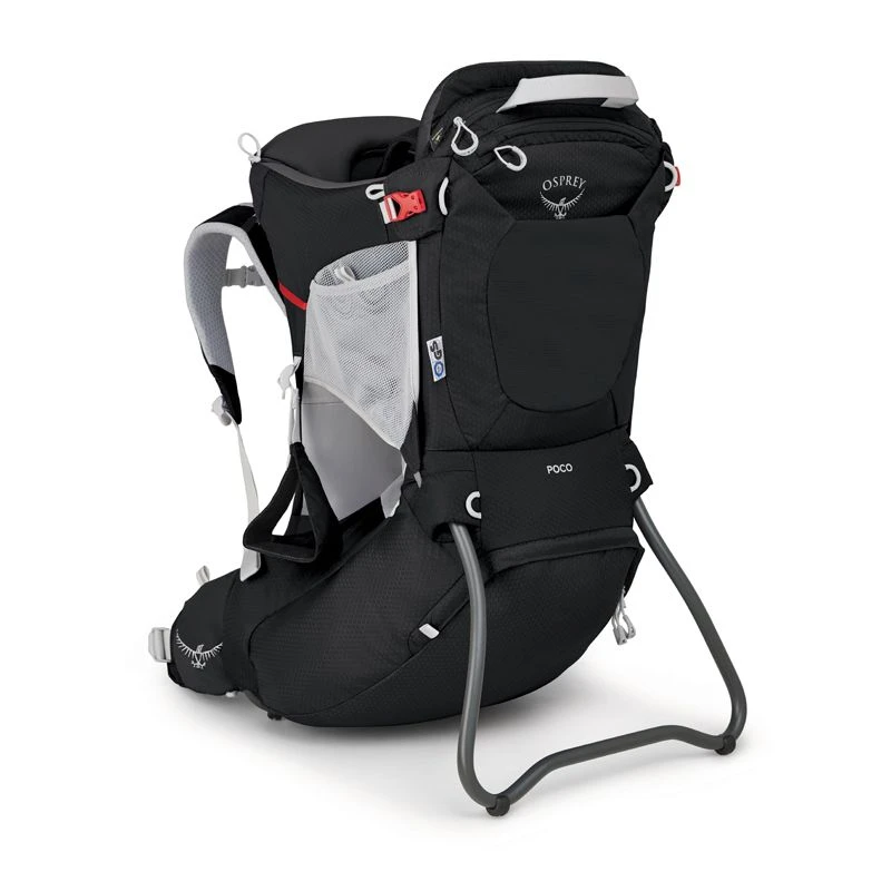 I toppen at stolen er der to gode håndtag, der kan det nemt at løfte stolen op og tage den på ryggen. Derudover er Poco forsynet med et støtteben, der gør det nemt at sætte junior ned i stolen og spænde ham / hende fast. Bemærk at stolen ikke er så stabil at den kan stå selv uden opsyn