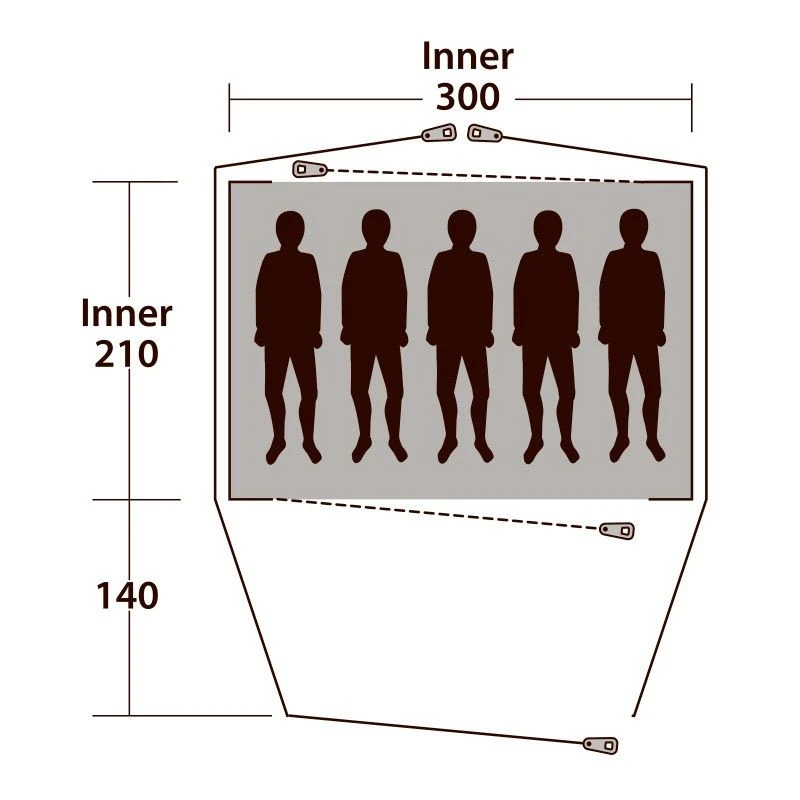 I forteltet på 140*300 cm er der masse af plads til bagagen, og hvis vejret gør det nødvendigt at trække indenfor er der også plads til et lille bord og stole, men det bliver nok lidt presset med 5 personer i forteltet. Forteltet er forsynet med aftagelig bund og store vinduer, der sikrer godt udsyn og masser af lys i teltet. Cloud 5 er udstyret med en ind- eller udgang i begge ender, hvilket f.eks. giver mulighed for gennemtræk, hvis varmen bliver for meget. Og så behøver man heller ikke træde hinanden i hælene på vej ind eller ud.