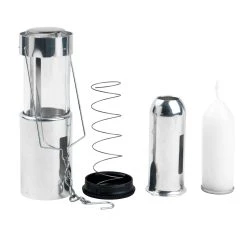 En fjederordning under lyset skubber langsomt dette op, mens det brænder ned. Lampen kan nemt skubbes sammen, så den tager mindre plads i oppakningen og glasset beskyttes.
